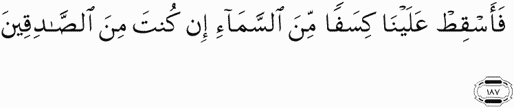 So cause to fall upon us fragments of the sky, if you should be of the truthful."
