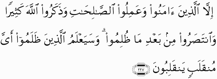 Except those [poets] who believe and do righteous deeds and remember Allah often and defend [the Muslims] after they were wronged. And those who have wronged are going to know to what [kind of] return they will be returned.