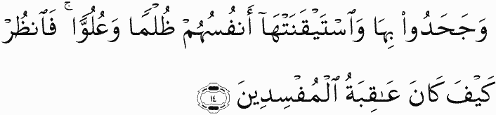 And they rejected them, while their [inner] selves were convinced thereof, out of injustice and haughtiness. So see how was the end of the corrupters.