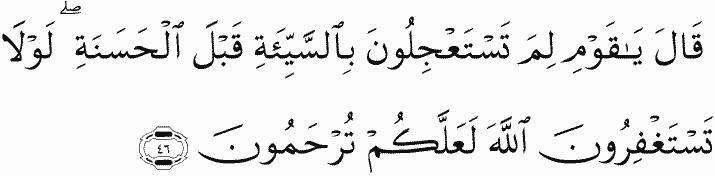 He said, "O my people, why are you impatient for evil instead of good? Why do you not seek forgiveness of Allah that you may receive mercy?"