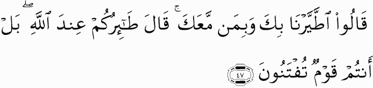 They said, "We consider you a bad omen, you and those with you." He said, "Your omen is with Allah . Rather, you are a people being tested."