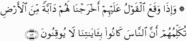 And when the word befalls them, We will bring forth for them a creature from the earth speaking to them, [saying] that the people were, of Our verses, not certain [in faith].