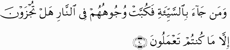 And whoever comes with an evil deed - their faces will be overturned into the Fire, [and it will be said], "Are you recompensed except for what you used to do?"