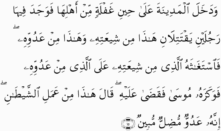 And he entered the city at a time of inattention by its people and found therein two men fighting: one from his faction and one from among his enemy. And the one from his faction called for help to him against the one from his enemy, so Moses struck him and [unintentionally] killed him. [Moses] said, "This is from the work of Satan. Indeed, he is a manifest, misleading enemy."