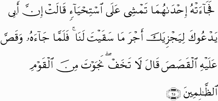 Then one of the two women came to him walking with shyness. She said, "Indeed, my father invites you that he may reward you for having watered for us." So when he came to him and related to him the story, he said, "Fear not. You have escaped from the wrongdoing people."
