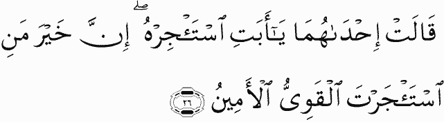 One of the women said, "O my father, hire him. Indeed, the best one you can hire is the strong and the trustworthy."