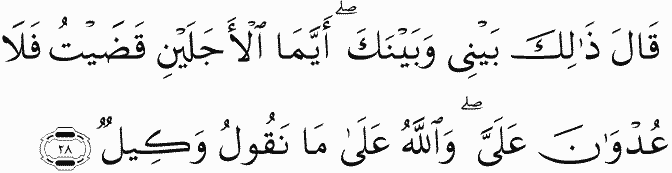 [Moses] said, "That is [established] between me and you. Whichever of the two terms I complete - there is no injustice to me, and Allah , over what we say, is Witness."