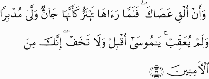And [he was told], "Throw down your staff." But when he saw it writhing as if it was a snake, he turned in flight and did not return. [ Allah said], "O Moses, approach and fear not. Indeed, you are of the secure.