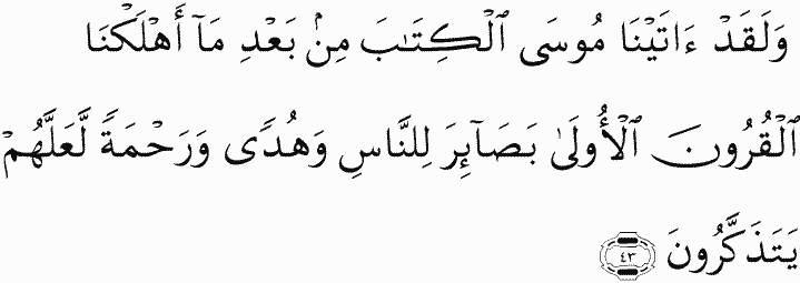 And We gave Moses the Scripture, after We had destroyed the former generations, as enlightenment for the people and guidance and mercy that they might be reminded.