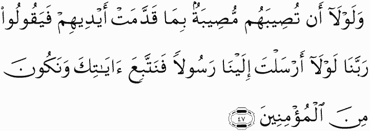 And if not that a disaster should strike them for what their hands put forth [of sins] and they would say, "Our Lord, why did You not send us a messenger so we could have followed Your verses and been among the believers?"...