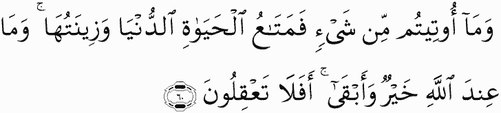 And whatever thing you [people] have been given - it is [only for] the enjoyment of worldly life and its adornment. And what is with Allah is better and more lasting; so will you not use reason?