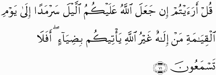 Say, "Have you considered: if Allah should make for you the night continuous until the Day of Resurrection, what deity other than Allah could bring you light? Then will you not hear?"