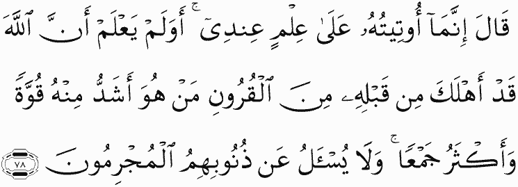 He said, "I was only given it because of knowledge I have." Did he not know that Allah had destroyed before him of generations those who were greater than him in power and greater in accumulation [of wealth]? But the criminals, about their sins, will not be asked.