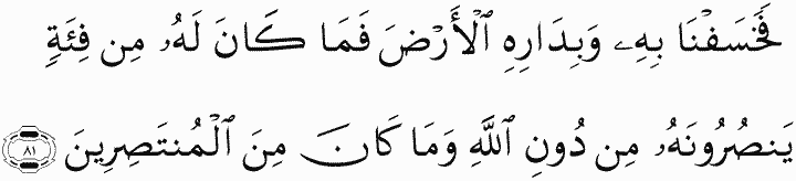 And We caused the earth to swallow him and his home. And there was for him no company to aid him other than Allah , nor was he of those who [could] defend themselves.