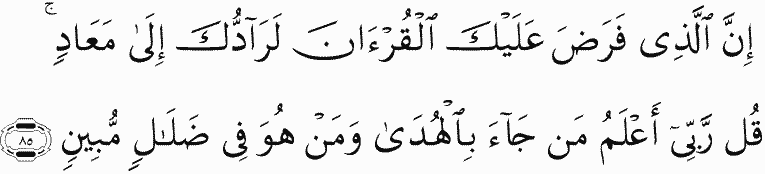 Indeed, [O Muhammad], He who imposed upon you the Qur'an will take you back to a place of return. Say, "My Lord is most knowing of who brings guidance and who is in clear error."