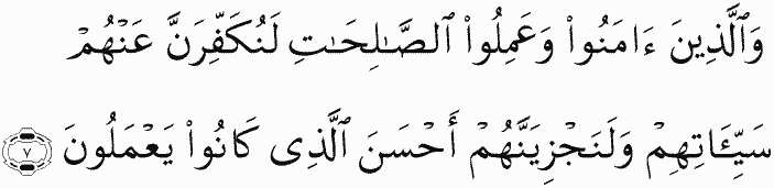 And those who believe and do righteous deeds - We will surely remove from them their misdeeds and will surely reward them according to the best of what they used to do.