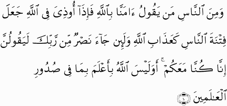 And of the people are some who say, "We believe in Allah ," but when one [of them] is harmed for [the cause of] Allah , they consider the trial of the people as [if it were] the punishment of Allah . But if victory comes from your Lord, they say, "Indeed, We were with you." Is not Allah most knowing of what is within the breasts of all creatures?