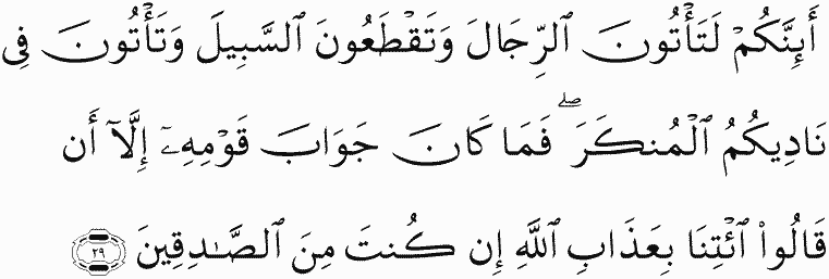 Indeed, you approach men and obstruct the road and commit in your meetings [every] evil." And the answer of his people was not but they said, "Bring us the punishment of Allah , if you should be of the truthful."