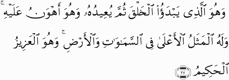 And it is He who begins creation; then He repeats it, and that is [even] easier for Him. To Him belongs the highest attribute in the heavens and earth. And He is the Exalted in Might, the Wise.