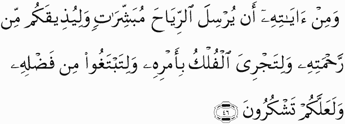 And of His signs is that He sends the winds as bringers of good tidings and to let you taste His mercy and so the ships may sail at His command and so you may seek of His bounty, and perhaps you will be grateful.