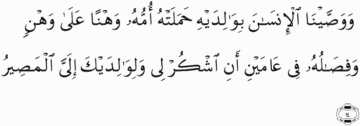And We have enjoined upon man [care] for his parents. His mother carried him, [increasing her] in weakness upon weakness, and his weaning is in two years. Be grateful to Me and to your parents; to Me is the [final] destination.