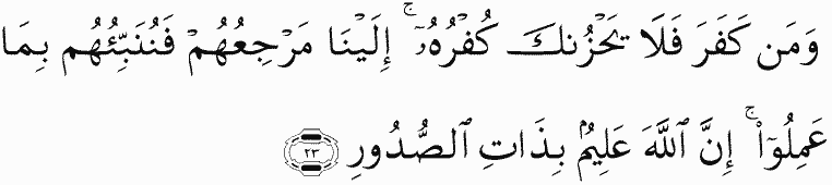 And whoever has disbelieved - let not his disbelief grieve you. To Us is their return, and We will inform them of what they did. Indeed, Allah is Knowing of that within the breasts.