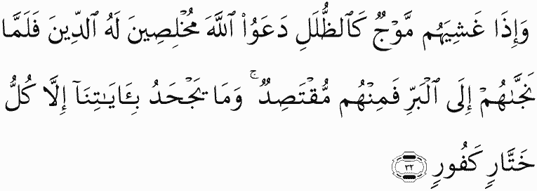 And when waves come over them like canopies, they supplicate Allah , sincere to Him in religion. But when He delivers them to the land, there are [some] of them who are moderate [in faith]. And none rejects Our signs except everyone treacherous and ungrateful.