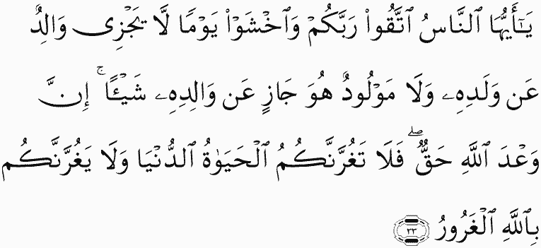 O mankind, fear your Lord and fear a Day when no father will avail his son, nor will a son avail his father at all. Indeed, the promise of Allah is truth, so let not the worldly life delude you and be not deceived about Allah by the Deceiver.