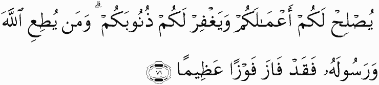 He will [then] amend for you your deeds and forgive you your sins. And whoever obeys Allah and His Messenger has certainly attained a great attainment.