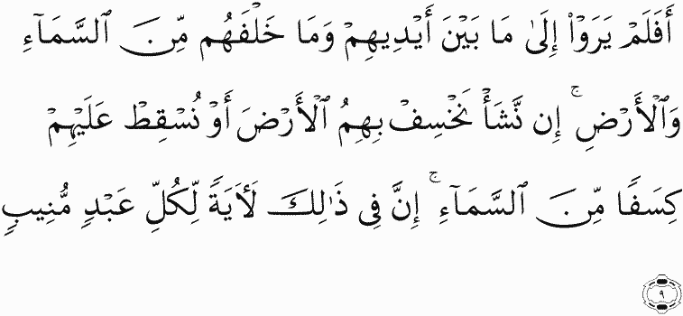 Then, do they not look at what is before them and what is behind them of the heaven and earth? If We should will, We could cause the earth to swallow them or [could] let fall upon them fragments from the sky. Indeed in that is a sign for every servant turning back [to Allah ].