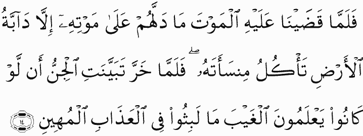 And when We decreed for Solomon death, nothing indicated to the jinn his death except a creature of the earth eating his staff. But when he fell, it became clear to the jinn that if they had known the unseen, they would not have remained in humiliating punishment.