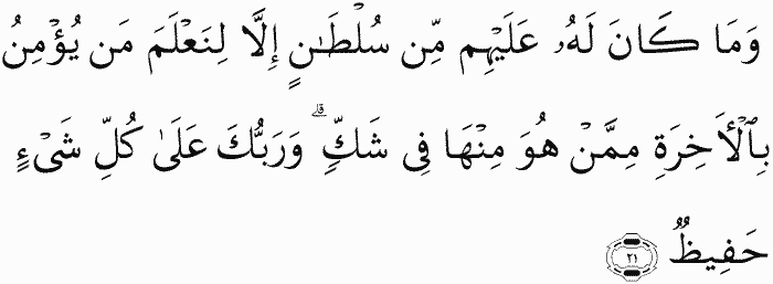 And he had over them no authority except [it was decreed] that We might make evident who believes in the Hereafter from who is thereof in doubt. And your Lord, over all things, is Guardian.