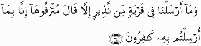 And We did not send into a city any warner except that its affluent said, "Indeed we, in that with which you were sent, are disbelievers."