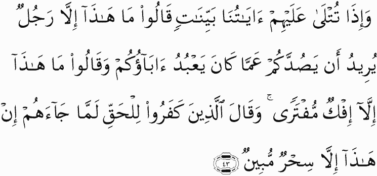 And when our verses are recited to them as clear evidences, they say, "This is not but a man who wishes to avert you from that which your fathers were worshipping." And they say, "This is not except a lie invented." And those who disbelieve say of the truth when it has come to them, "This is not but obvious magic."