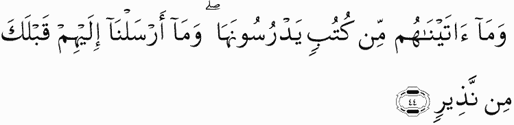 And We had not given them any scriptures which they could study, and We had not sent to them before you, [O Muhammad], any warner.