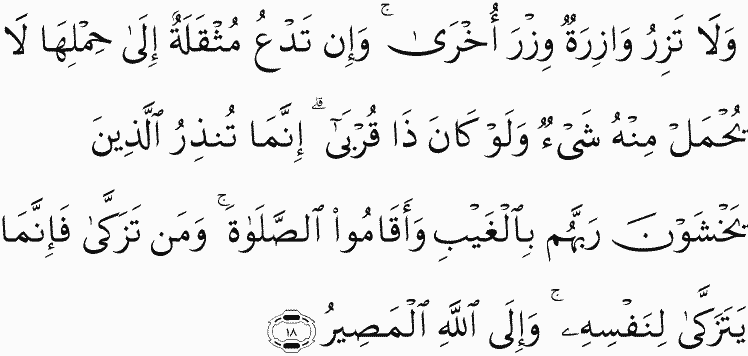 And no bearer of burdens will bear the burden of another. And if a heavily laden soul calls [another] to [carry some of] its load, nothing of it will be carried, even if he should be a close relative. You can only warn those who fear their Lord unseen and have established prayer. And whoever purifies himself only purifies himself for [the benefit of] his soul. And to Allah is the [final] destination.