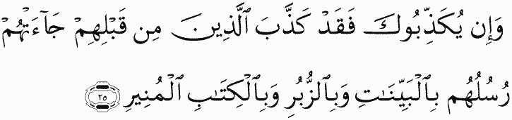 And if they deny you - then already have those before them denied. Their messengers came to them with clear proofs and written ordinances and with the enlightening Scripture.