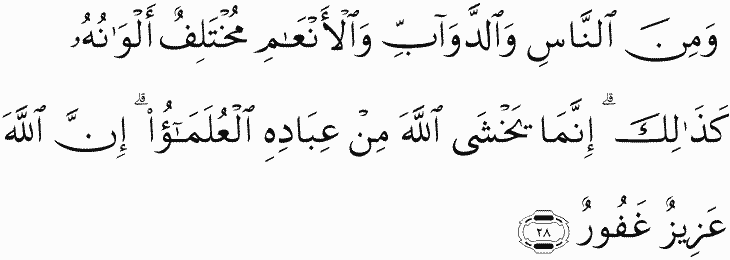 And among people and moving creatures and grazing livestock are various colors similarly. Only those fear Allah , from among His servants, who have knowledge. Indeed, Allah is Exalted in Might and Forgiving.
