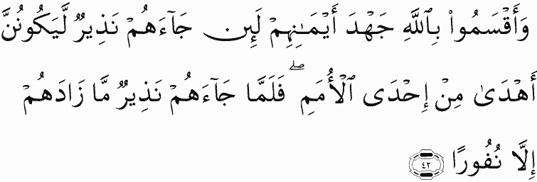 And they swore by Allah their strongest oaths that if a warner came to them, they would be more guided than [any] one of the [previous] nations. But when a warner came to them, it did not increase them except in aversion.