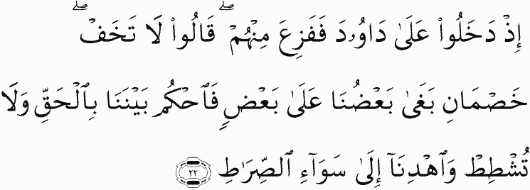 When they entered upon David and he was alarmed by them? They said, "Fear not. [We are] two adversaries, one of whom has wronged the other, so judge between us with truth and do not exceed [it] and guide us to the sound path.