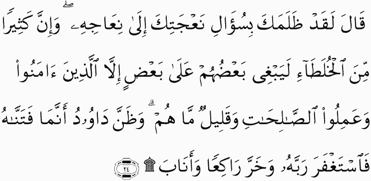 [David] said, "He has certainly wronged you in demanding your ewe [in addition] to his ewes. And indeed, many associates oppress one another, except for those who believe and do righteous deeds - and few are they." And David became certain that We had tried him, and he asked forgiveness of his Lord and fell down bowing [in prostration] and turned in repentance [to Allah ].