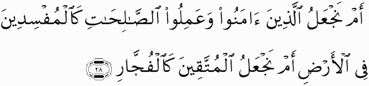 Or should we treat those who believe and do righteous deeds like corrupters in the land? Or should We treat those who fear Allah like the wicked?
