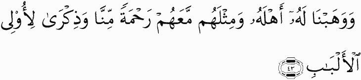 And We granted him his family and a like [number] with them as mercy from Us and a reminder for those of understanding.