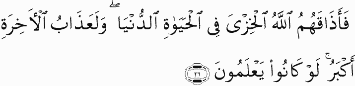 So Allah made them taste disgrace in worldly life. But the punishment of the Hereafter is greater, if they only knew.