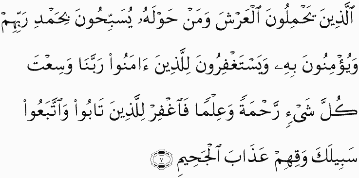 Those [angels] who carry the Throne and those around it exalt [ Allah ] with praise of their Lord and believe in Him and ask forgiveness for those who have believed, [saying], "Our Lord, You have encompassed all things in mercy and knowledge, so forgive those who have repented and followed Your way and protect them from the punishment of Hellfire.