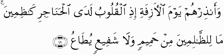 And warn them, [O Muhammad], of the Approaching Day, when hearts are at the throats, filled [with distress]. For the wrongdoers there will be no devoted friend and no intercessor [who is] obeyed.