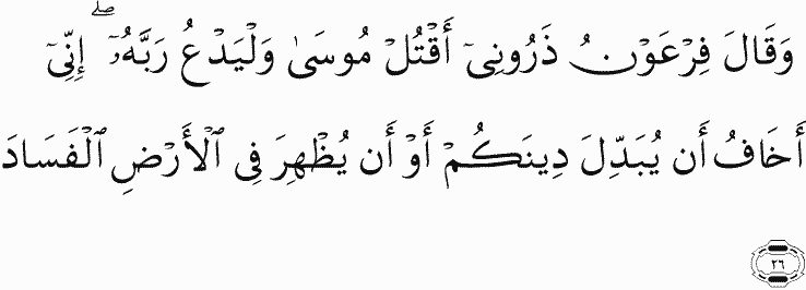 And Pharaoh said, "Let me kill Moses and let him call upon his Lord. Indeed, I fear that he will change your religion or that he will cause corruption in the land."
