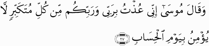 But Moses said, "Indeed, I have sought refuge in my Lord and your Lord from every arrogant one who does not believe in the Day of Account."
