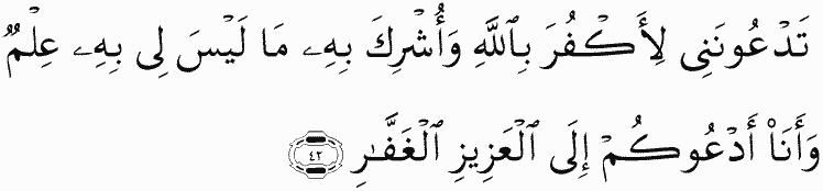 You invite me to disbelieve in Allah and associate with Him that of which I have no knowledge, and I invite you to the Exalted in Might, the Perpetual Forgiver.