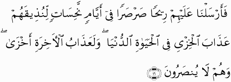 So We sent upon them a screaming wind during days of misfortune to make them taste the punishment of disgrace in the worldly life; but the punishment of the Hereafter is more disgracing, and they will not be helped.